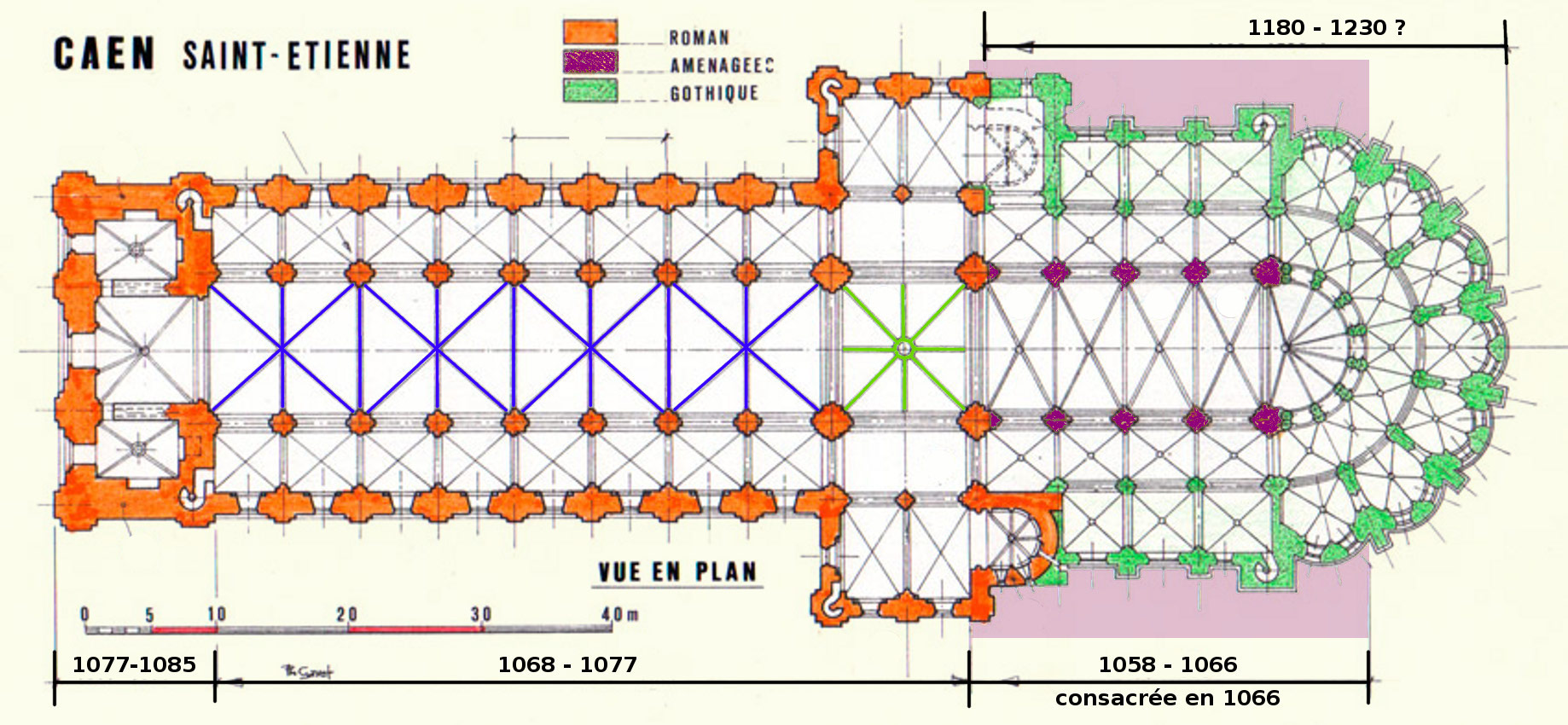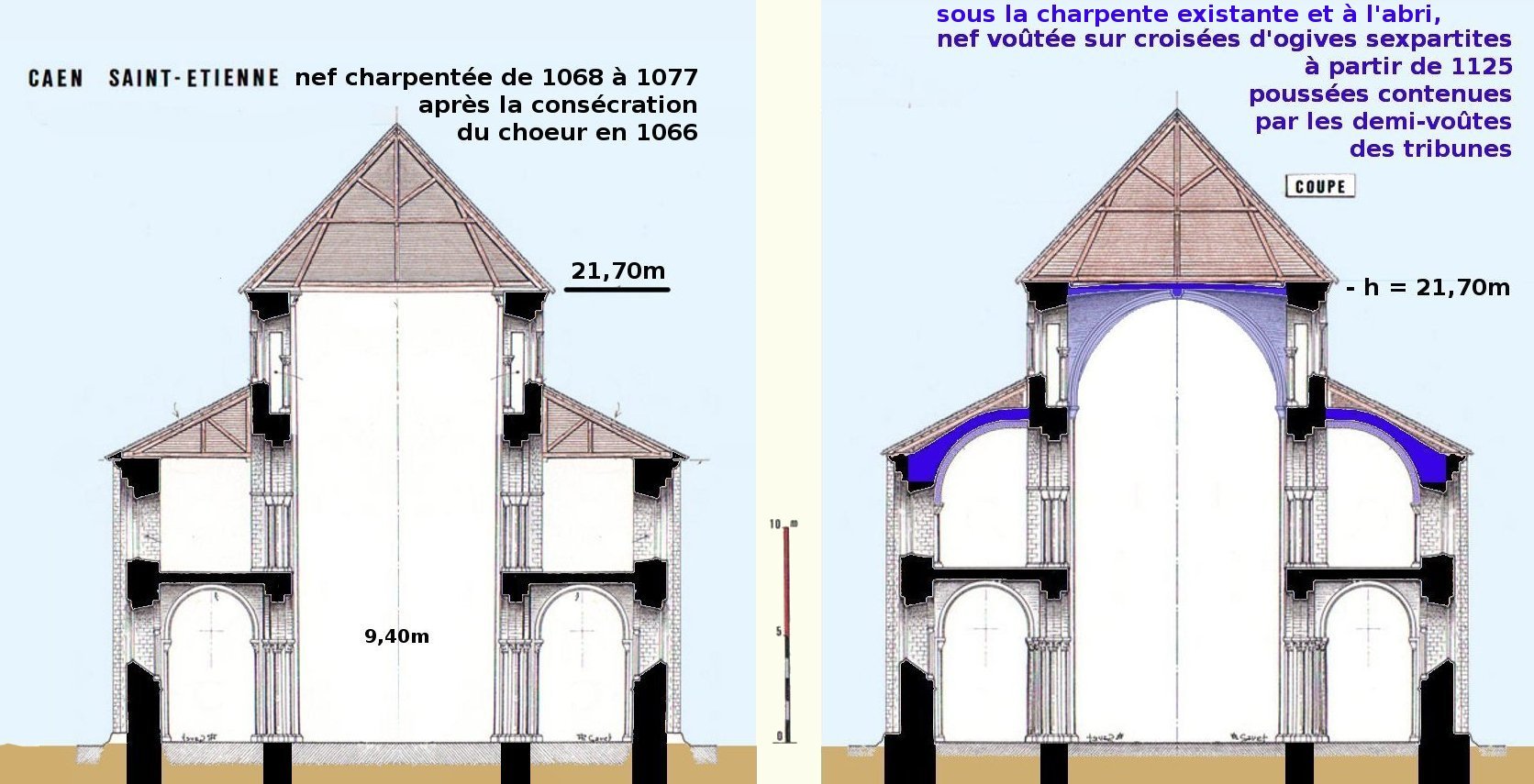 A partir de 1125, le chantier de Saint-Etienne bénéficie des enseignements et des expérimentations conduites à Lessay à l'abbatiale Sainte-Trinité voûtée sur croisées d'ogives quadripartites avant 1098 puis à Caen à l'abbatiale Sainte-Trinité dont le voûtement, de 1120 à 1125 sur croisées d'ogives sexpartites, a obligé à renforcer les murs initiaux. Les poussées du voûtement réalisé de 1125 à 1130 (en bleu) dans la nef de Saint-Etienne sont contrebutées par les demi-berceaux construits en nouvelle couverture des tribunes, inaugurant une solution élégante qui sera également adoptée par les moines cisterciens, d'autres bénédictins, notamment pour leurs abbatiales provençales.