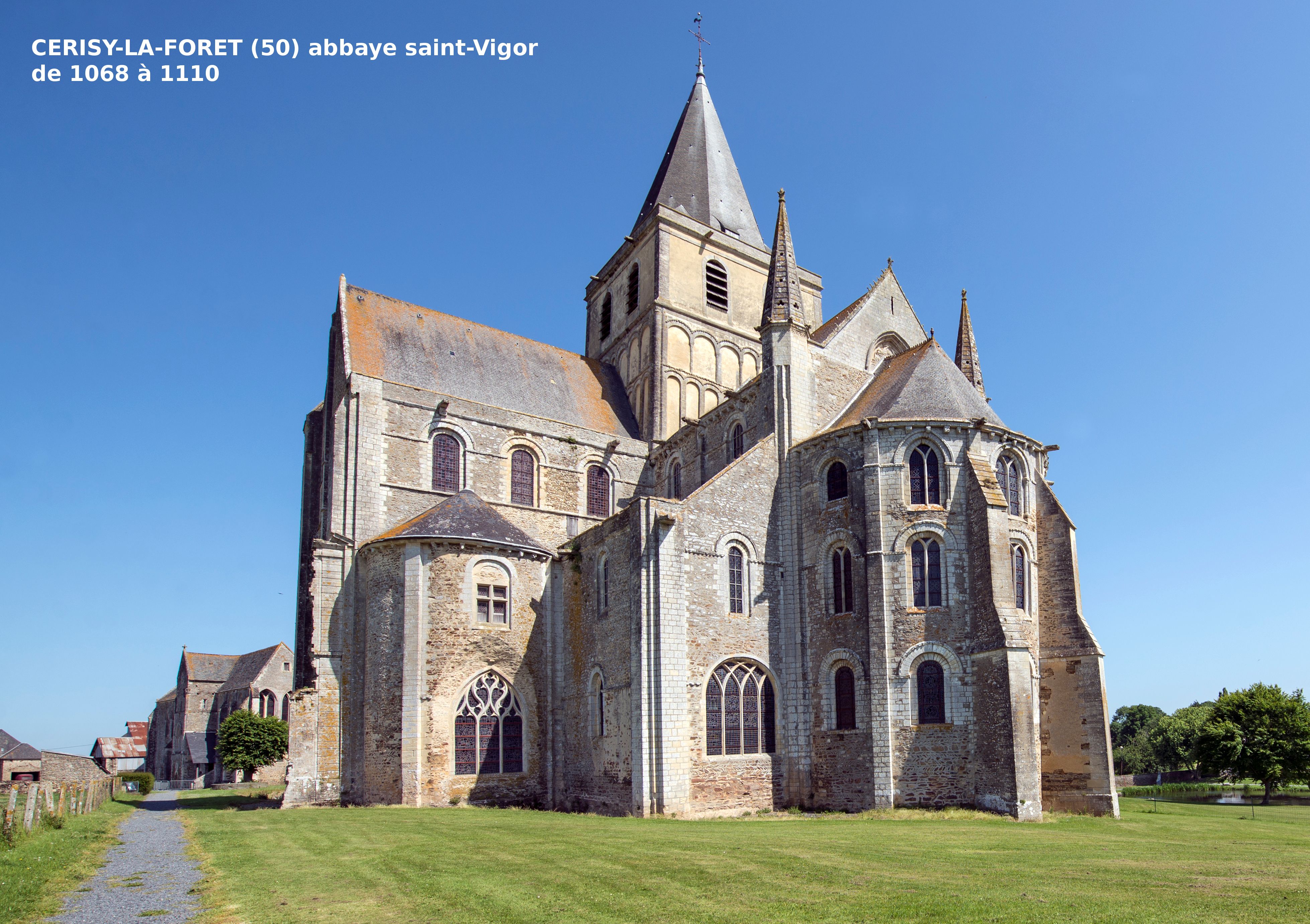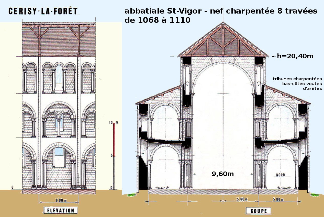 L'abbatiale Saint-Vigor de Cerisy-la-Forêt (50) a été partiellement démontée après avoir été vendue comme Bien National à l'issue de la Révolution. Comptant originellement huit travées (trois seulement sont conservées), sa vaste nef n'a jamais été voûtée et est restée charpentée. L'abbaye d'homme de Cerisy a été fondée en 1032 par le duc de Normandie Robert le Magnifique (1027-1035, le père de Guillaume futur le Conquérant) par une charte rédigée avant son départ pour Jérusalem où il mourut. Le duc Guillaume a repris la construction à partir de 1042, mais la partie la plus ancienne encore visible est l'abside du choeur à trois niveaux, construite entre 1068 et 1072.