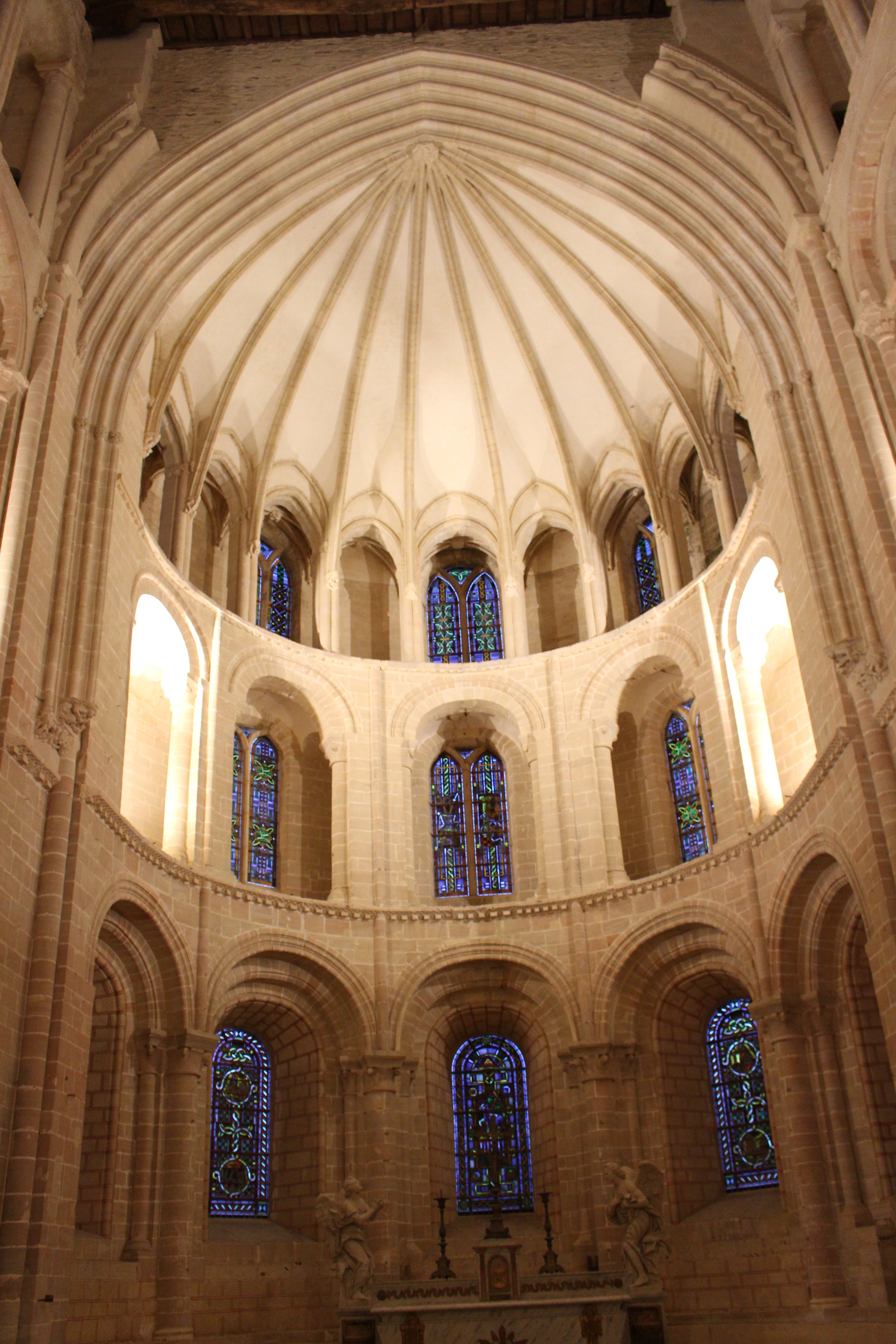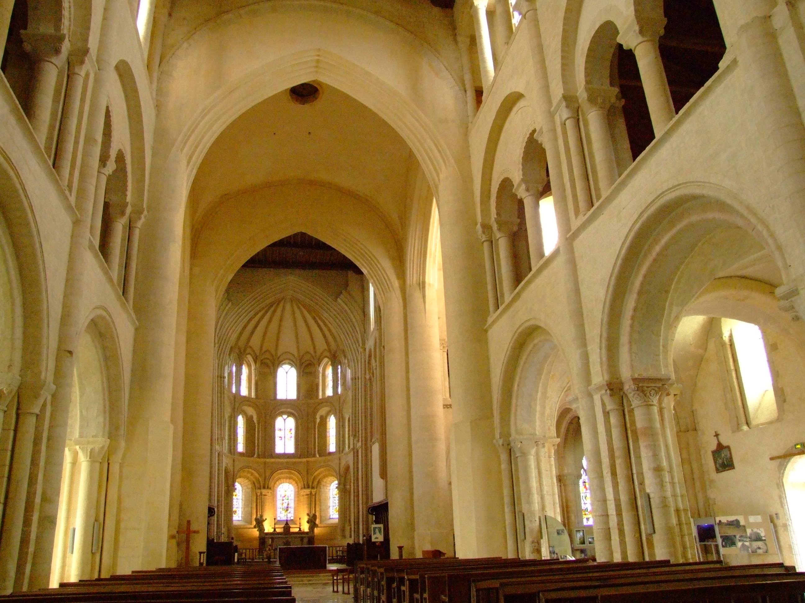Vue générale de l'abside axiale aux trois niveaux de fenêtres romanes (1068-1072) dont le dernier a été réaménagé au XIIIe siècle pour soutenir le voûtement rayonnant sur nervures (= ogives). Au premier plan, les grandes arcades de la croisée de transept sont du XVe siècle :