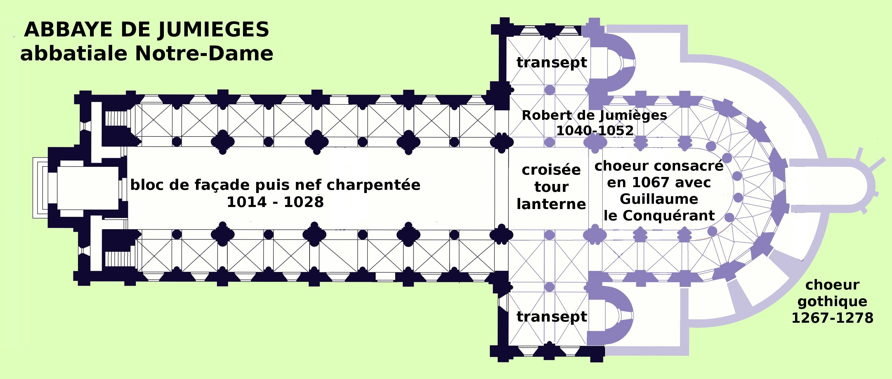 plan des différentes phases du chantier entre la reprise du bloc de façade et la nef charpentée entre 1014 et 1028 (en noir), complétée par les transepts et la croisée puis un nouveau choeur, de 1040 à 1052 par Robert de Jumièges (en violet foncé) avec la dédicace en 1067 par Maurille archevêque de la cathédrale de Rouen, en présence de Guillaume roi d'Angleterre arrière-petit-fils de Guillaume Longue-Epée déjà cité :