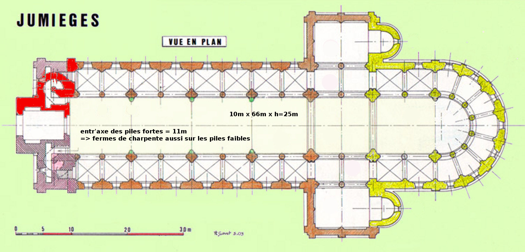 abbatiale Notre-Dame de Jumièges (76) plan des différentes phases de chantier entre la reprise du bloc de façade et la nef charpentée entre 1014 et 1028, complétée par le transept et le choeur de 1040 à 1052 par Robert de Jumièges