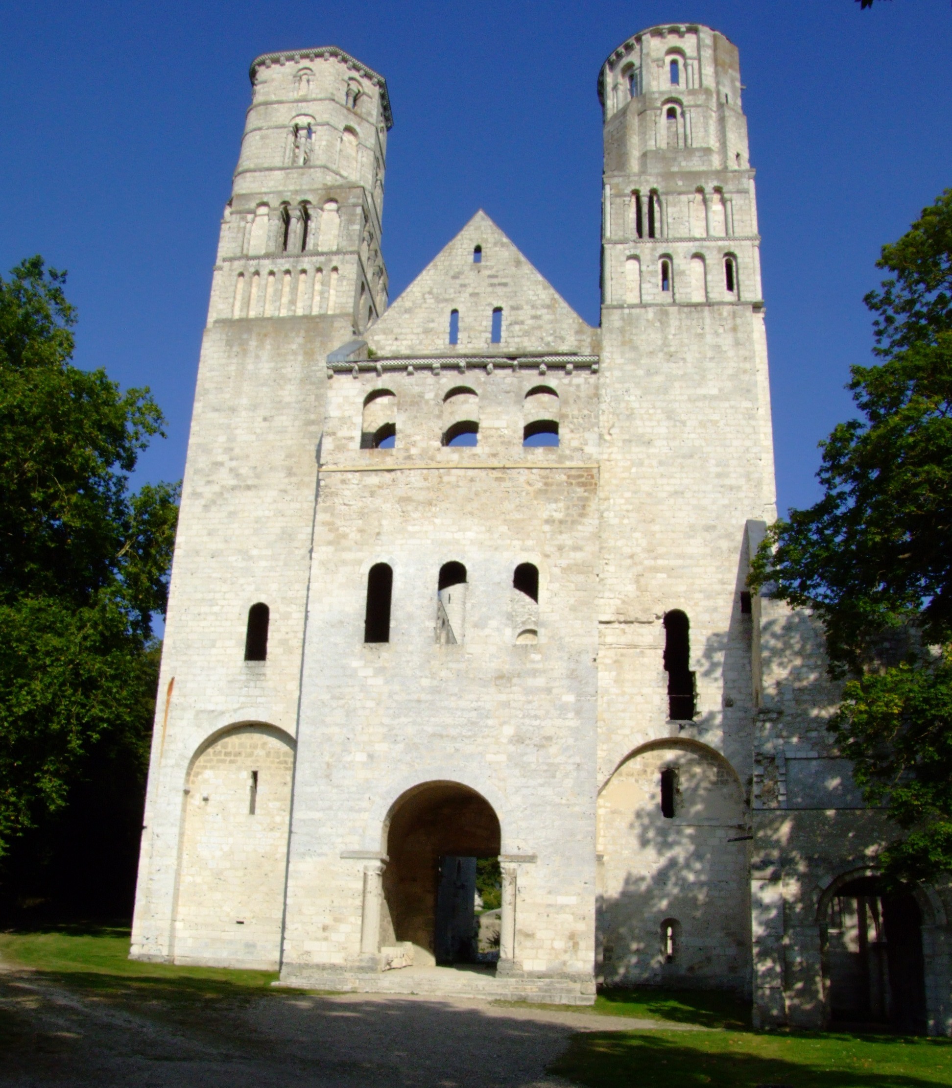 abbatiale Notre-Dame de Jumièges (76) repris par l'abbé Thierry à partir de 1014, le bloc de façade occidental de tradition carolingienne est encadré par deux tours hautes de 46m