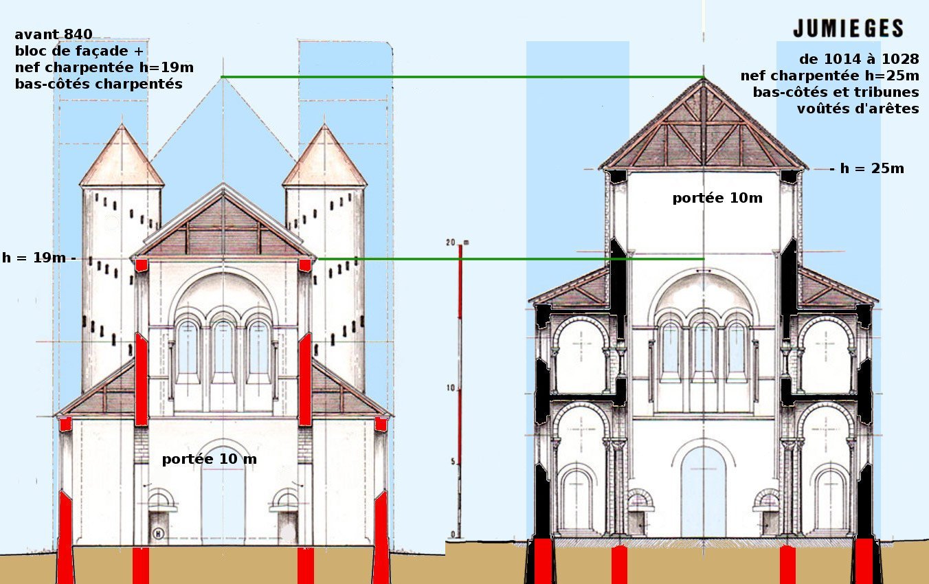abbatiale Notre-Dame de Jumièges (76) sections des nefs montrant le revers de façade : comparaison entre l'état carolingien en rouge et la reprise par l'abbé Thierry de 1014 à 1028 devant le profil des tours complétées par Robert de Jumièges avant 1052