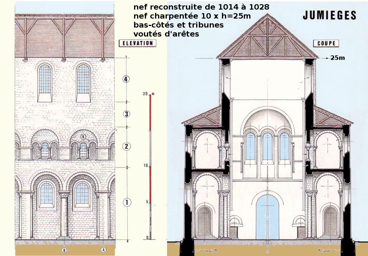 abbatiale Notre-Dame de Jumièges (76) élévation intérieure et section de la nef charpentée