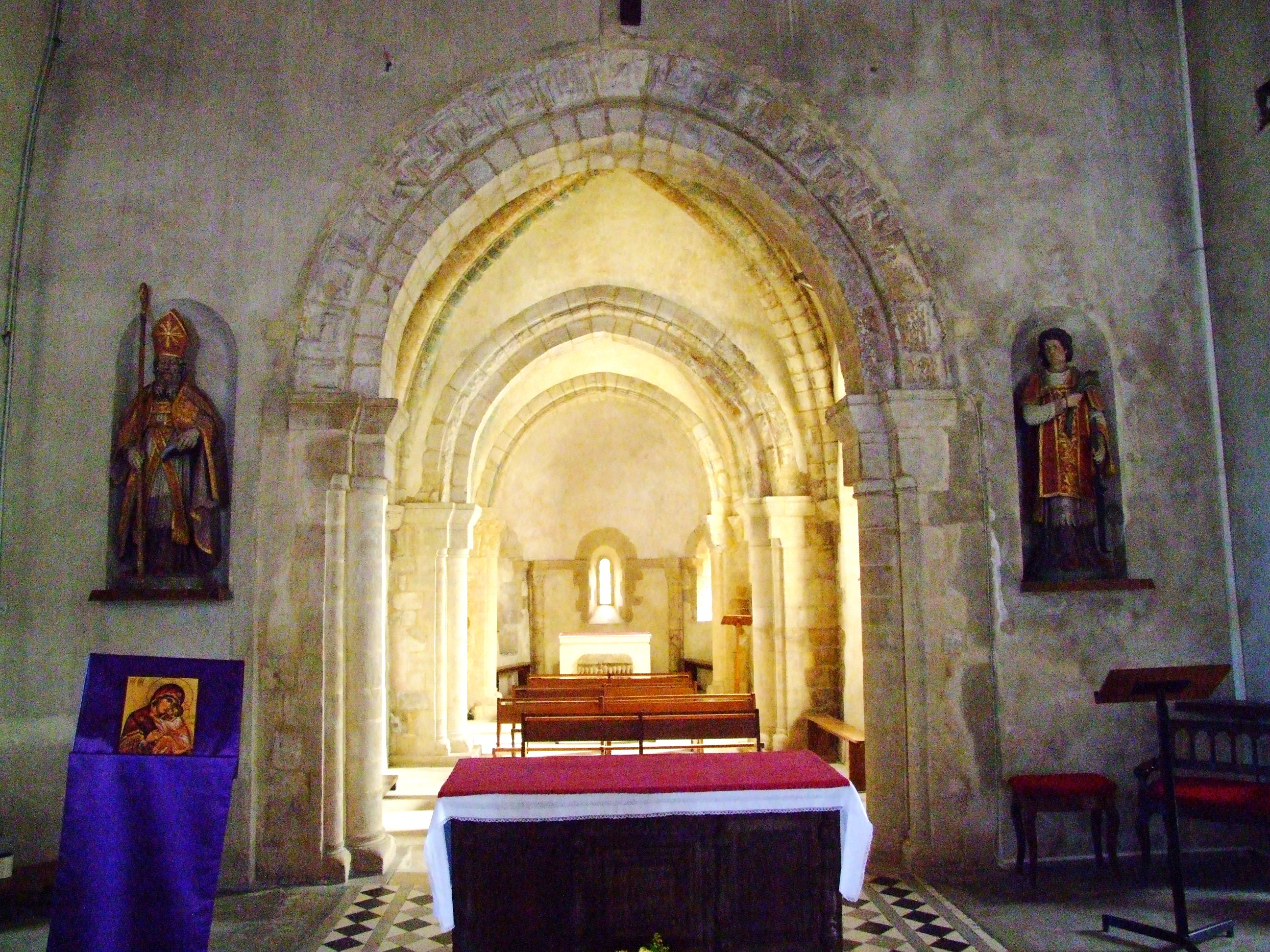 Vue depuis l'autel vers la nef, la construction montre des imperfections d'alignement tout-à-fait communes en ces hautes époques de la charnière entre le roman et le gothique au début du XIIe siècle, et normales dans une église paroissiale de campagne :