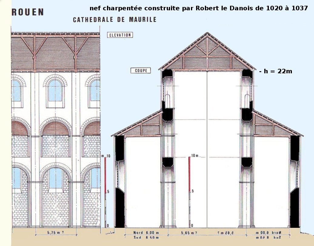 Comparaison entre les sections transversales de la nef charpentée de Robert le Danois reconstruite de 1020 à 1037 et consacrée par Maurille en 1067 de présence de Guillaume le Conquérant,