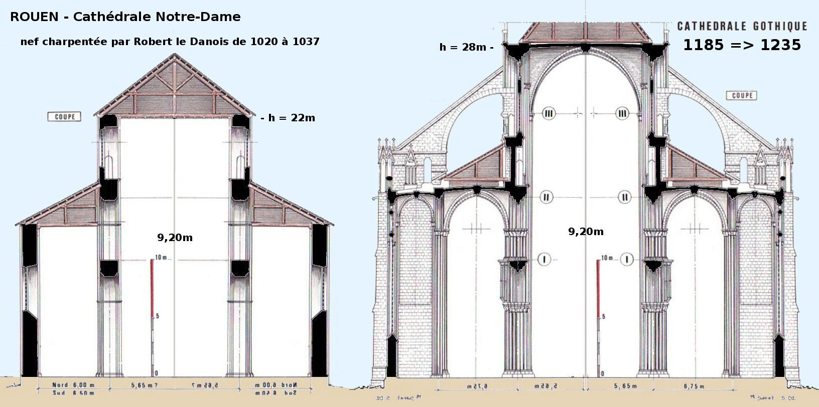 cathédrale Notre-Dame de Rouen (76) sections des nefs de la cathédrale romane de 1020 à 1037 et de la cathédrale gothique de 1200 à 1235