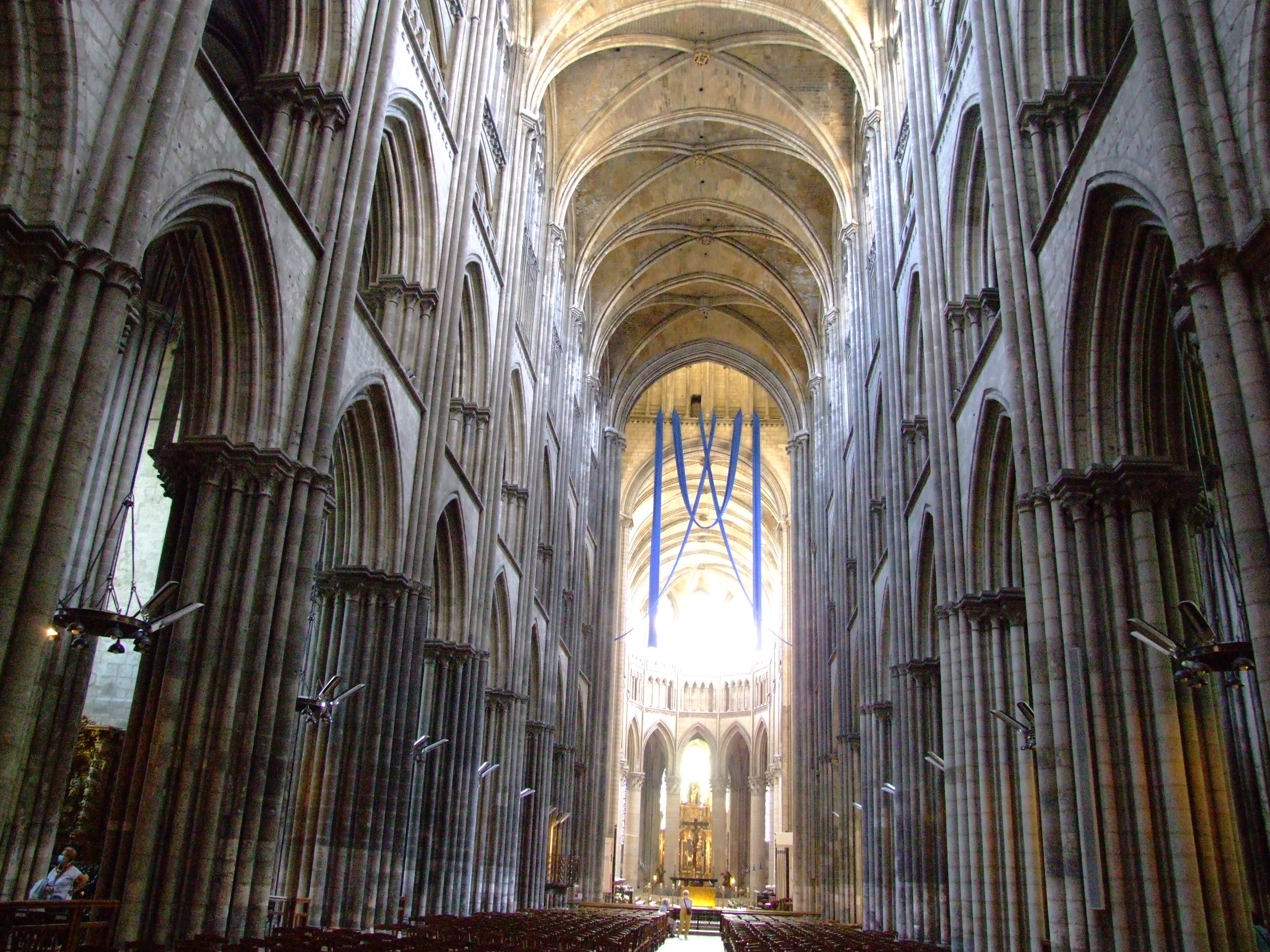 cathédrale Notre-Dame de Rouen (76) vue générale de la nef gothique de 1200 à 1235 : la verticalité est soulignée par l'effet des colonnettes fasciculées