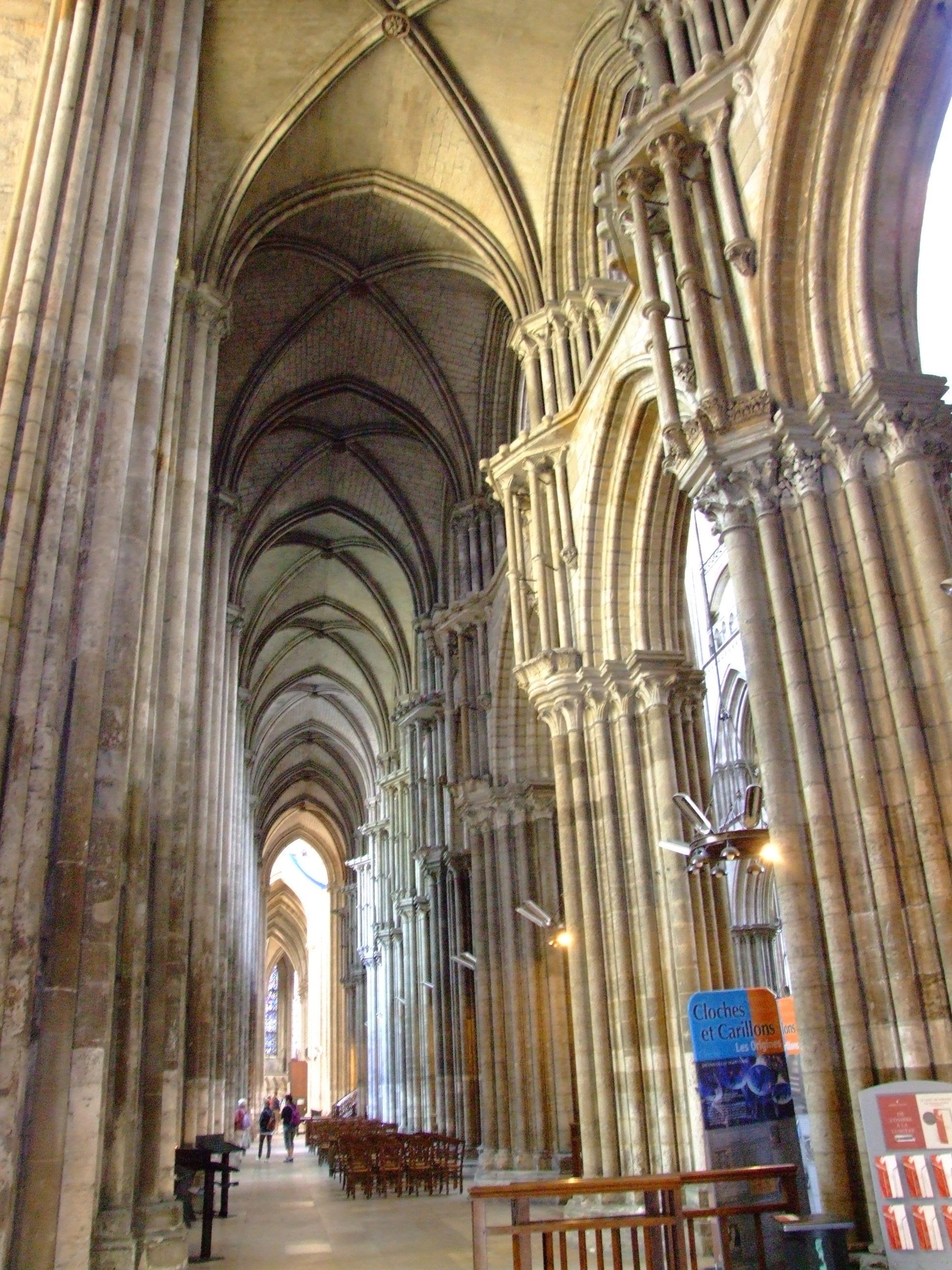 L'intérieur du bas-côté est à Rouen très haut, plus de 17m et la verticalité y est également soulignées par le jeu des ombres et lumières sur les colonnettes :