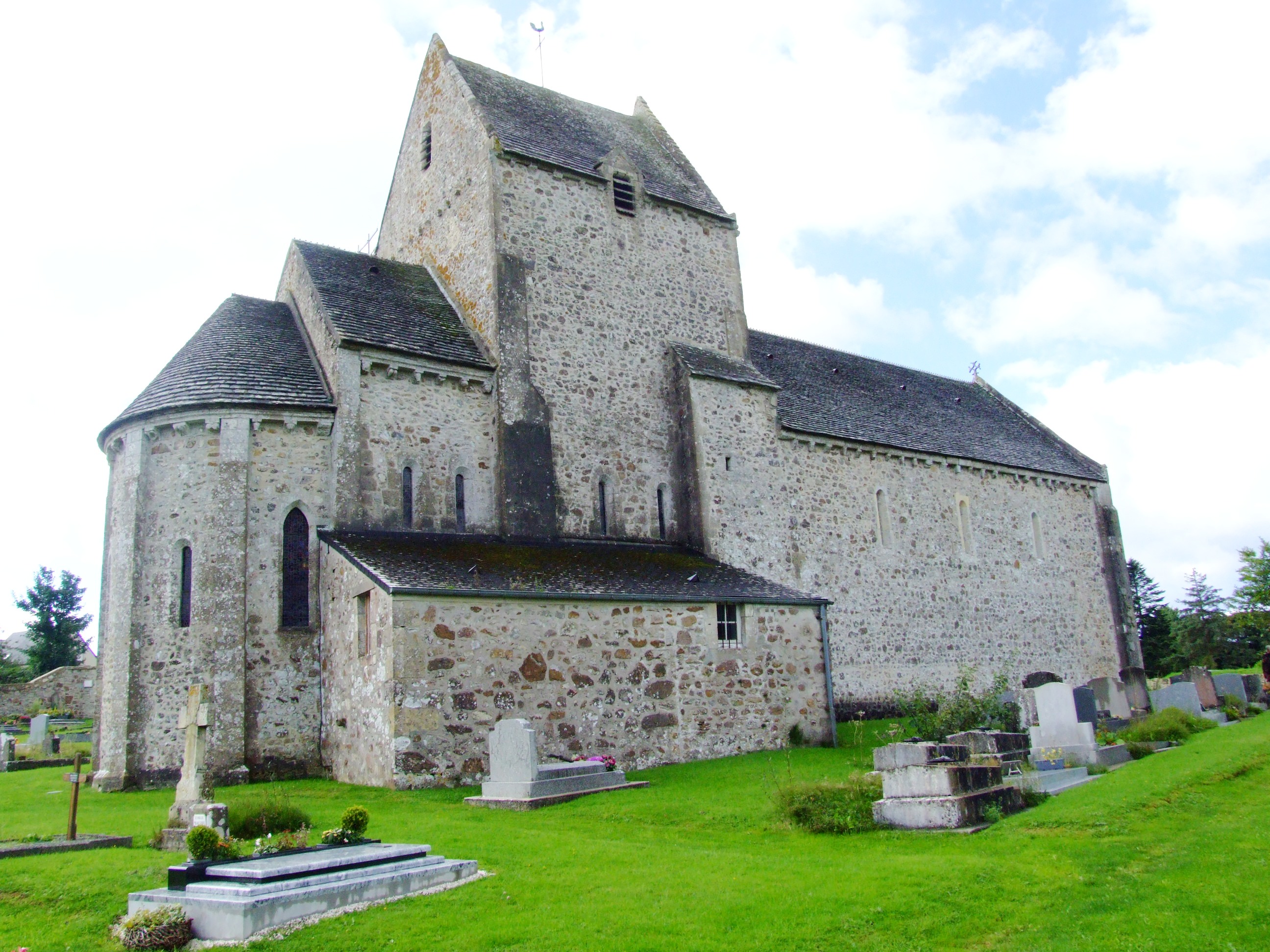 Saint-Martin de Tollevast (50) vu du nord-est, le chevet roman roman du début du XIIe s. et sa tour au toit en bâtière prolongent une nef plus ancienne