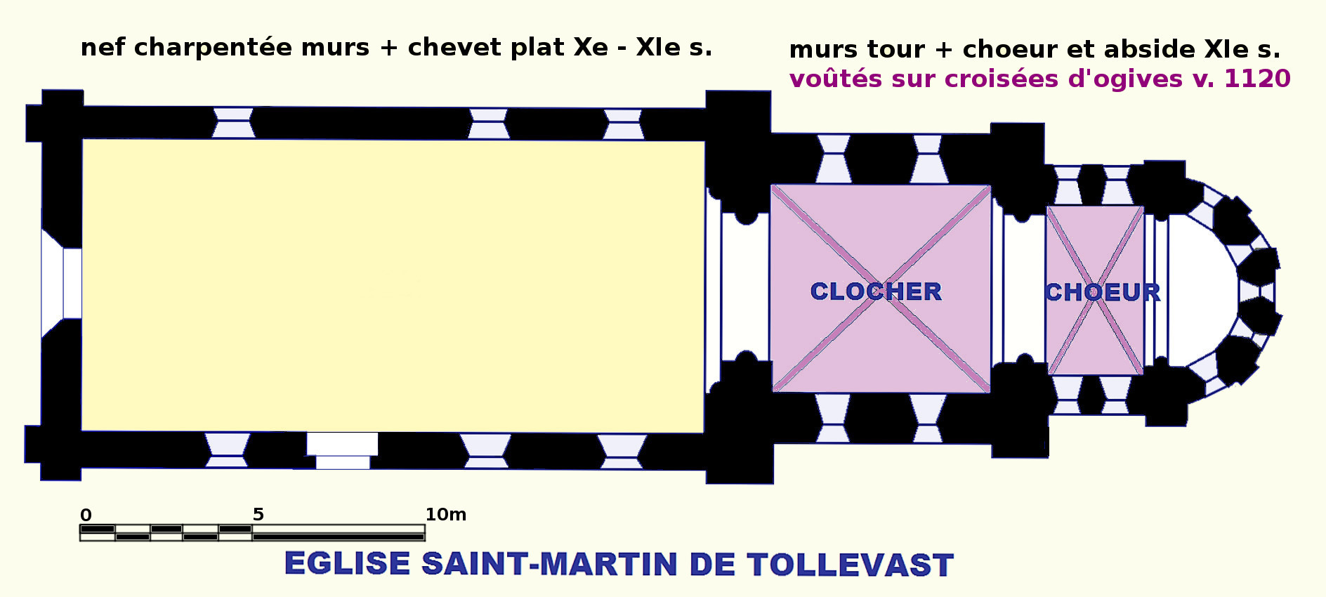 Plan de l'église Saint-Martin de Tollevast, avec la nef d'origine carolingienne en jaune (le dessin des fenêtres de la nef est devenu faux en raison de la réouverture des fenêtres du XIe), complétée par deux travées droites allant en se rétrécissant avant l'abside romane. Les murs de la deuxième travée de choeur sont également plus fins que ceux de la première travée du XIe s. supportant le clocher, et les voûtements sur croisées d'ogives remontent au premier quart du XIIe siècle :