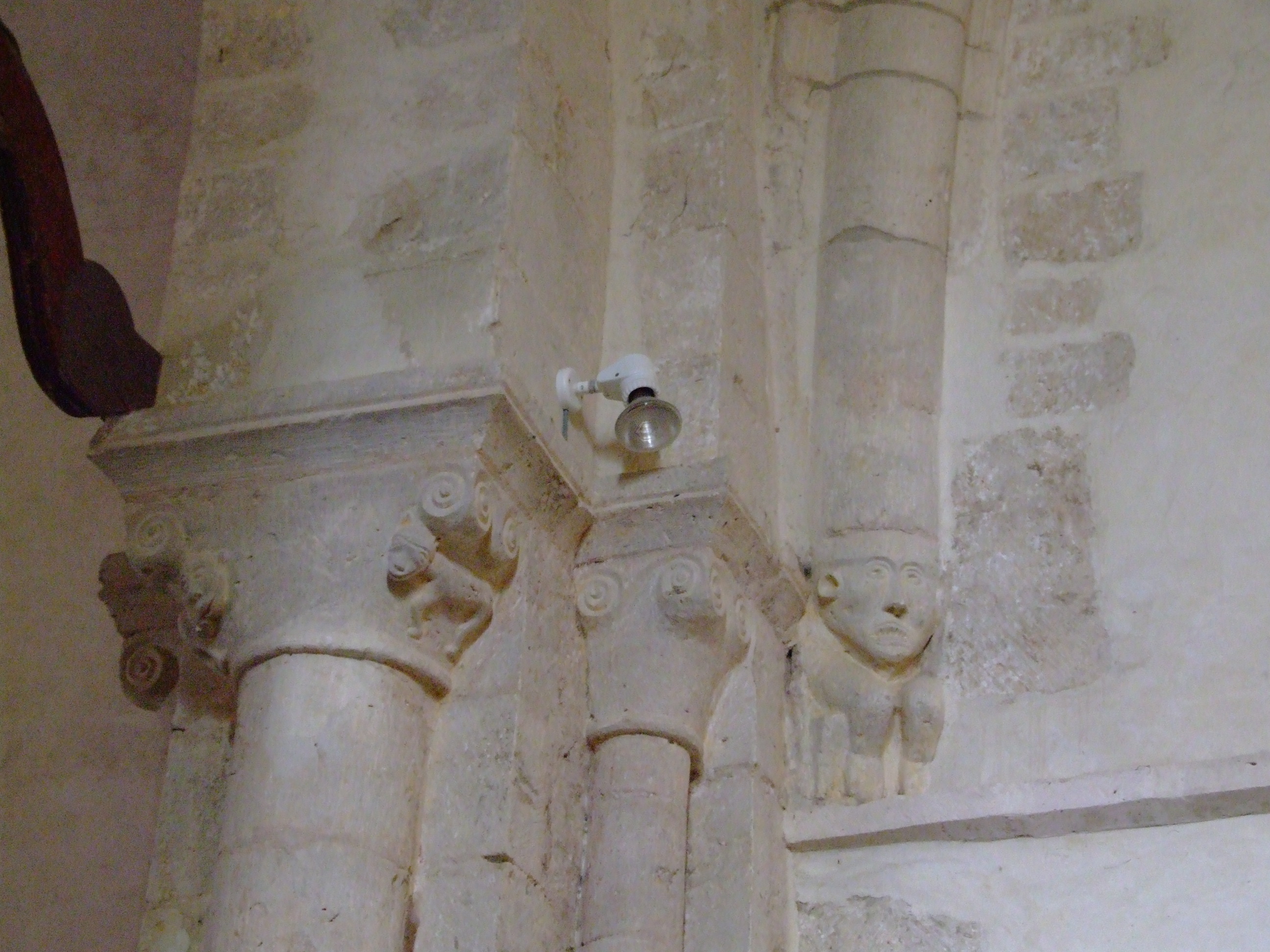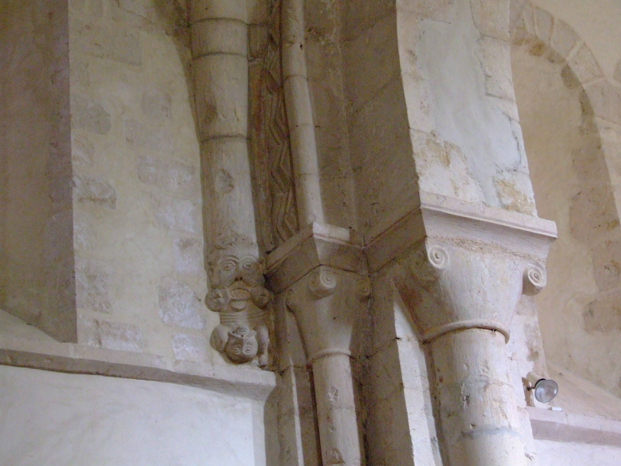 Détail des chapiteaux nord de l'arc triomphal et d'une hypothétique première structure voûtée de la première travée droite : les sculptures sont bien homogènes tant dans leur pierre que stylistiquement :