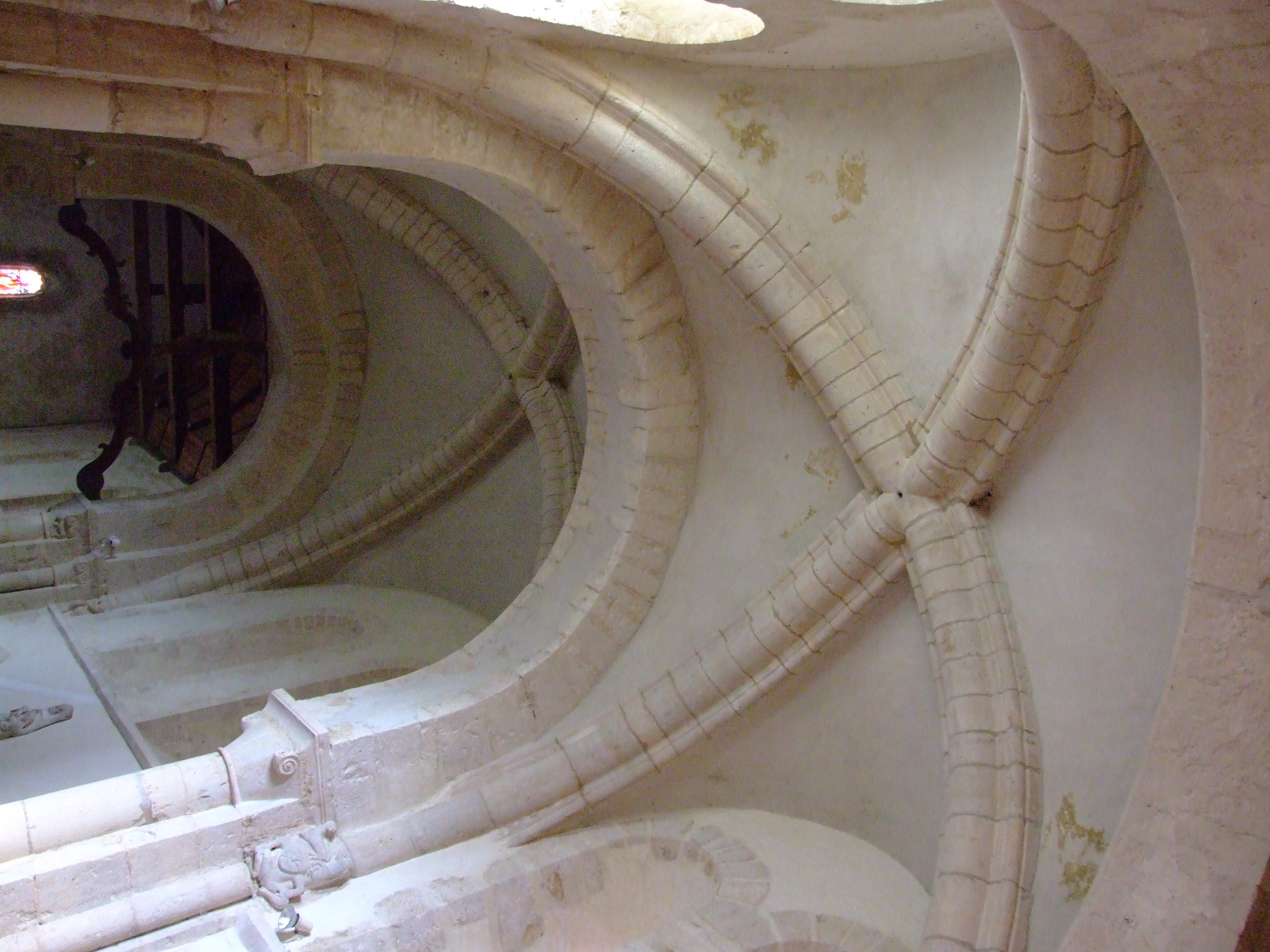 Vue de la voûte d'arête sur croisée d'ogives du début du XIIe s. de la deuxième travée droite du choeur. Dans les angles, les colonnettes verticales sur culots sculptés semblent également archaïques en comparaison des ogives qui s'y appuient :