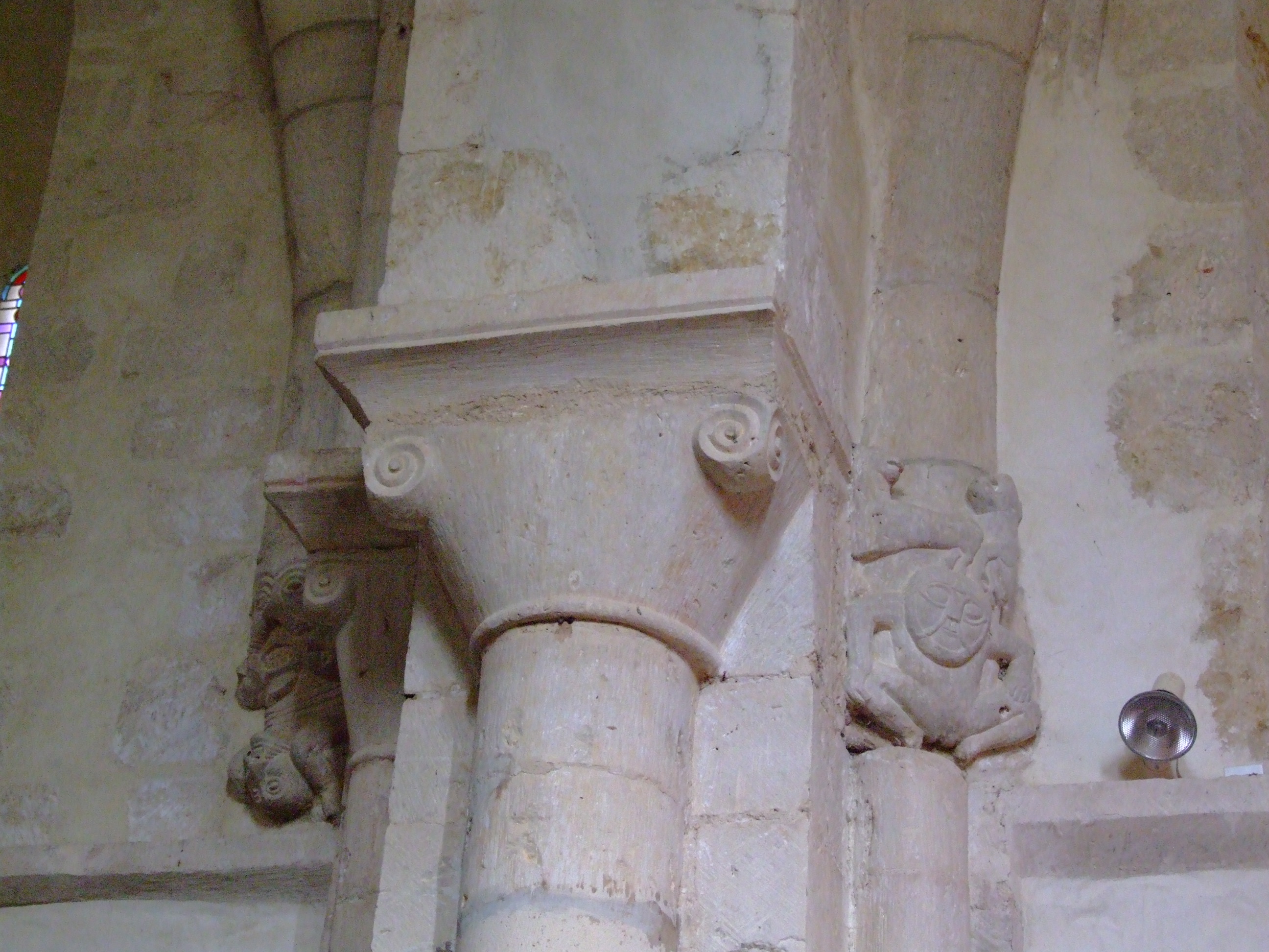 Détail des chapiteaux nord-ouest entre la première et la deuxième travée droite : les sculptures sont bien homogènes tant dans leur pierre que stylistiquement :