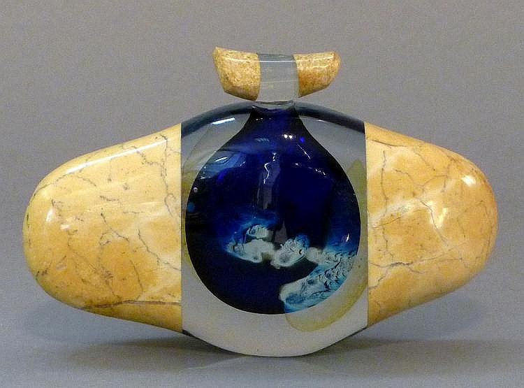 Au début des années 2000, Eric et Agnès Laurent expérimentent de nouvelles voies en associant la pierre et le verre, soufflé pour certaines pièces, ou coulé à la canne pour les plus spectaculaires pouvant atteindre 90kg ! Voici un flacon ainsi composé "Pierre et Verre" : un flacon applati en verre soufflé est prolongé de deux demi-galets de pierre assemblés à la colle U.V. . L'ensemble (y compris le bouchon) est ensuite taillé et poli :