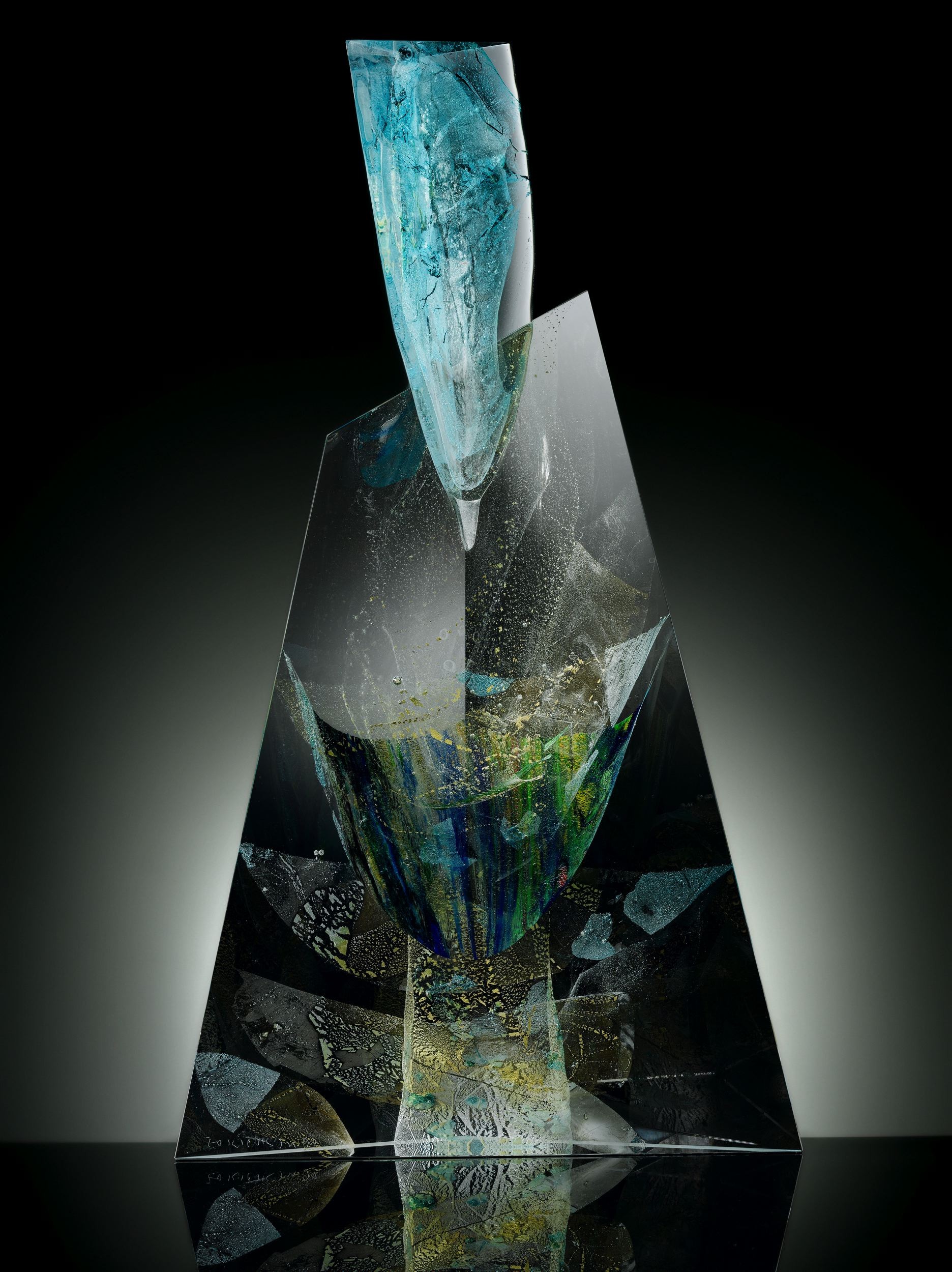 Cette manière de rapporter à chaud des paraisons fait flotter des voiles de couleurs ou de feuilles d'argent ou d'or à l'intérieur d'une masse parfaitement transparente montre qu'Eric Laurent a imaginé un chemin personnel aboutissant à un résultat spectaculaire antérieurement atteint par Yan Zoritchak (né en 1944, voir par exemple https://fr.wikipedia.org/wiki/Yan_Zoritchak) avec par exemple ses "Fleurs Célestes" dont les volutes colorés flottent au milieu d'un bloc de cristal triangulaire parfaitement poli qui en multiplie les images réfléchies (https://yanzoritchak.com/) ici en 2013 :