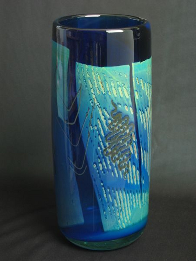 Voici une pièce de 1986 soufflée par Nicolas Morin, un vase cylindrique au décor intercalaire "aquarium" de feuilles de paillon d'argent recouvertes d'un graphisme de fils de verre, qui annonce ses décors "déroulé-roulé":