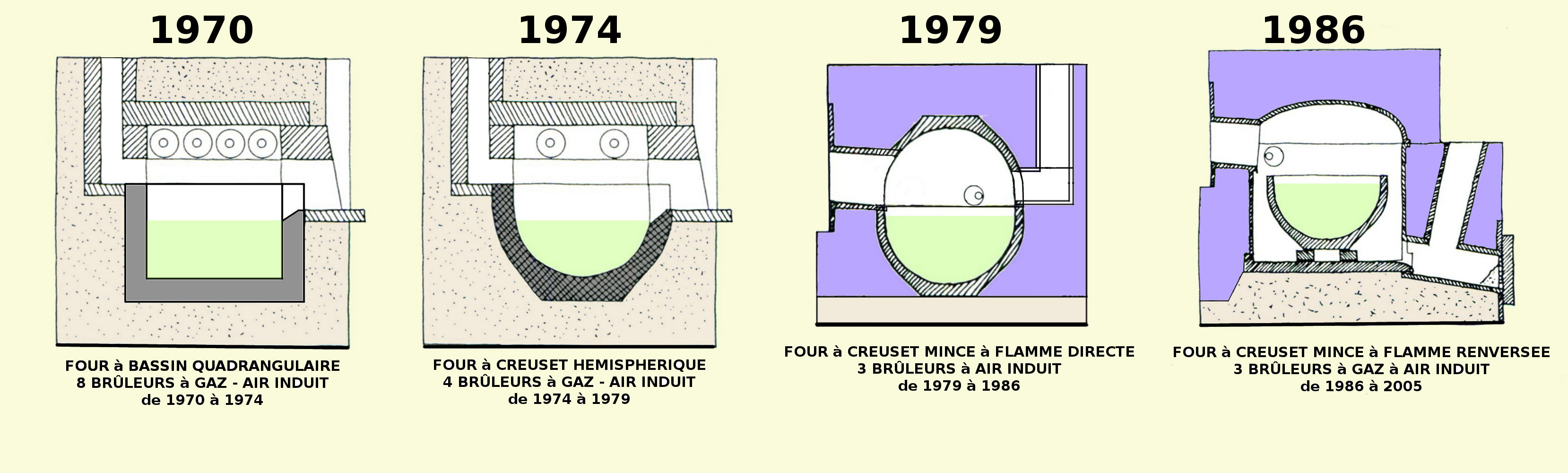 Verrerie Le Pontil - Dieulefit (26) évolution des fours de fusion entre 1970, 1974, 1979 et 1986 avec l'introduction des fibres céramiques isolantes et la flamme renversée tournante
