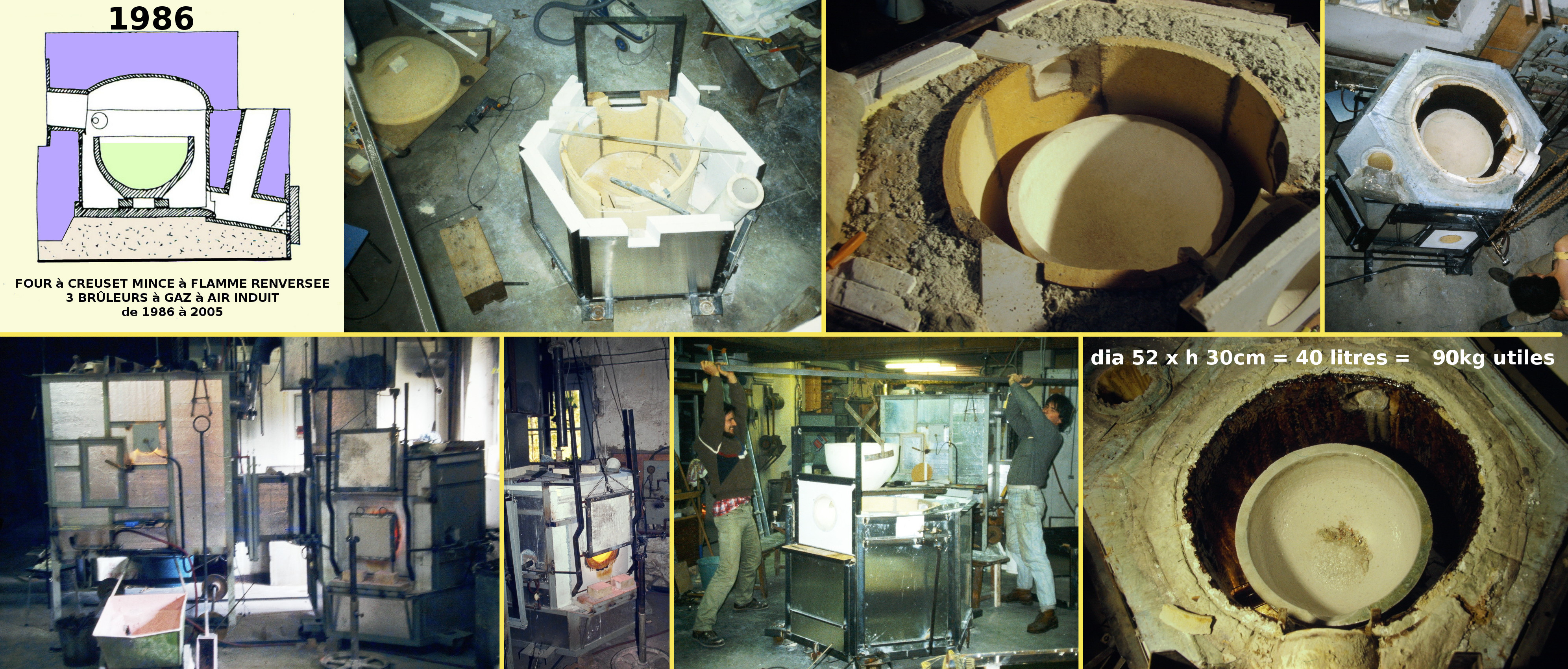 Voici le récapitulatif de l'évolution des formes vers la sphère et des isolations de fibres céramiques réfractaires des fours de fusion en usage à Dieulefit de 1970 à 1986 :