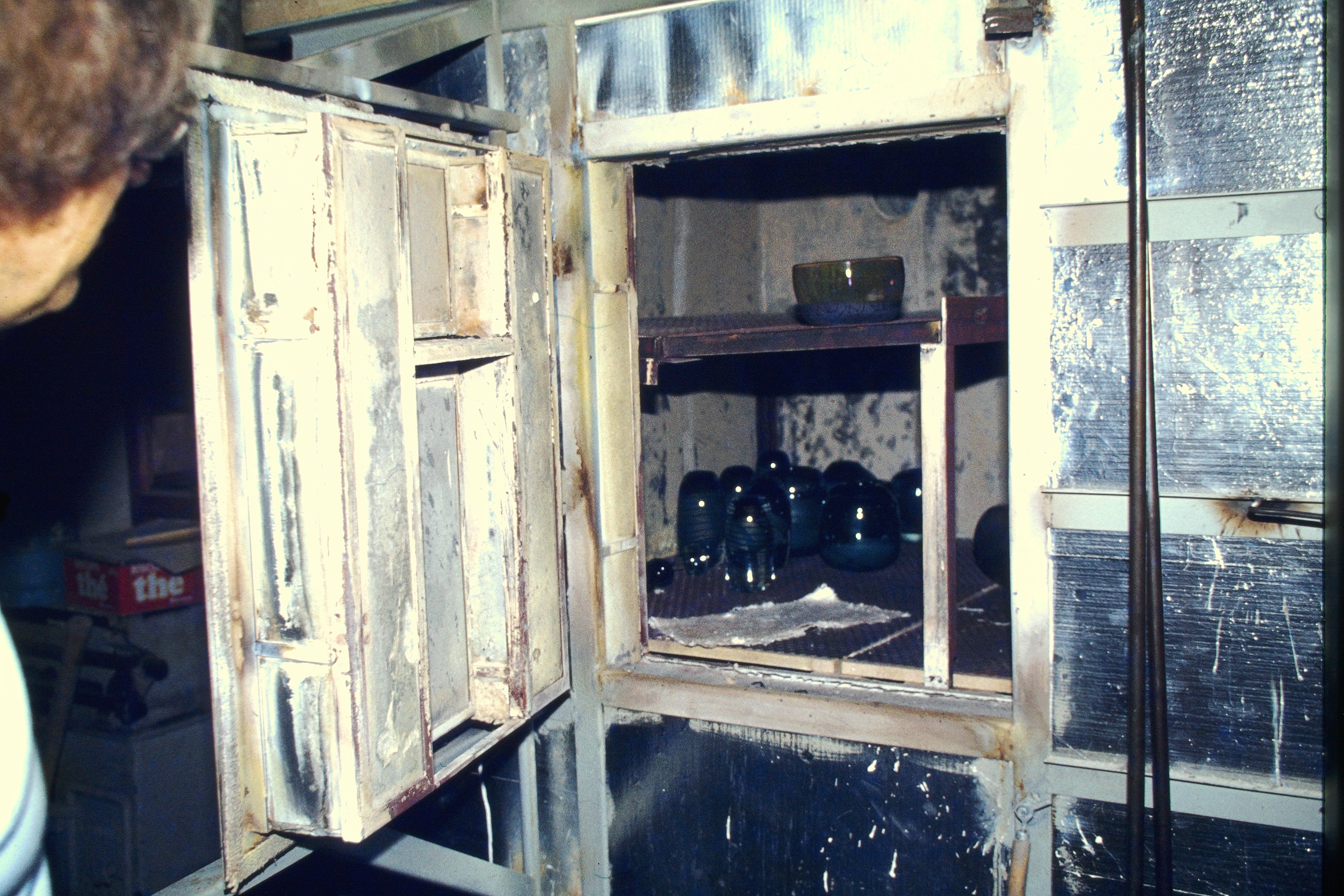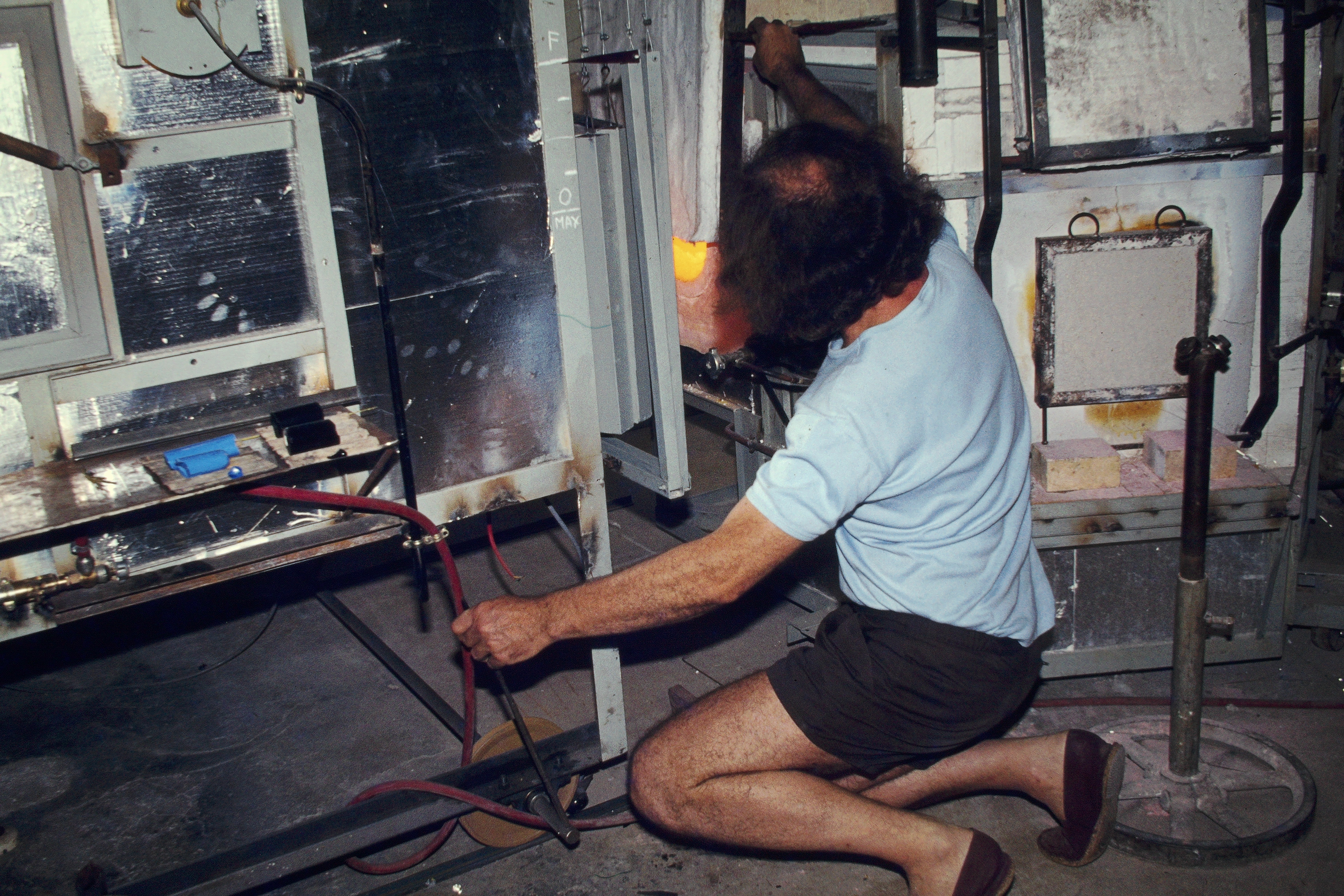 La préparation avait fait l'objet de soins attentifs. Tout d'abord, Nicolas souffle de simples cylindres à la peau intérieure colorée de différentes couleurs. Lorsqu'ils sont froids, il en découpe les fonds et les fend pour les étendre comme du verre à vitrail suivant la technique dite "en manchons" dans un four spécial qu'il a construit pour pratiquer le thermoformage :