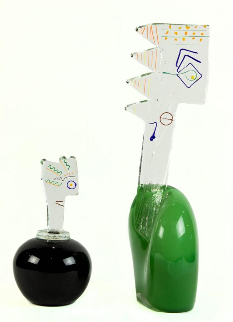 Nicolas Morin + Catherine Sintès - Verrerie Le Pontil à Dieulefit (26) deux sculptures de flacon à gauche et buste à droite vers 1997, photo Invaluable.com