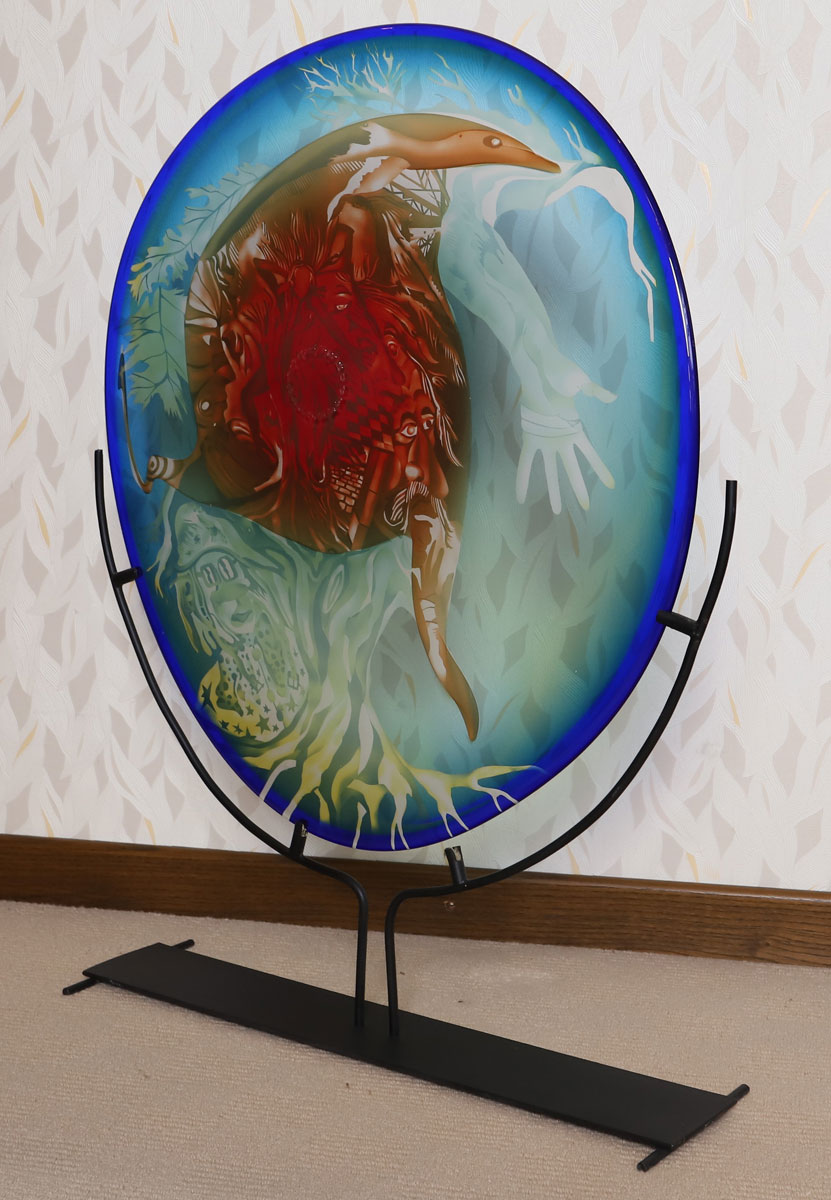 Parmi les très nombreux artistes venus travailler avec Nicolas Morin pour bénéficier de sa grande expérience, voici Jean-Paul Raymond (né en 1948, voir par exemple https://de.wikipedia.org/wiki/Jean-Paul_Raymond qui a soufflé avec Nicolas, dans les années 1990, de grandes coupes aux multiples couleurs superposées en couches, destinées à être sablées par Jean-Paul Raymond dans son atelier personnel pour composer des graphismes colorés très modernes :